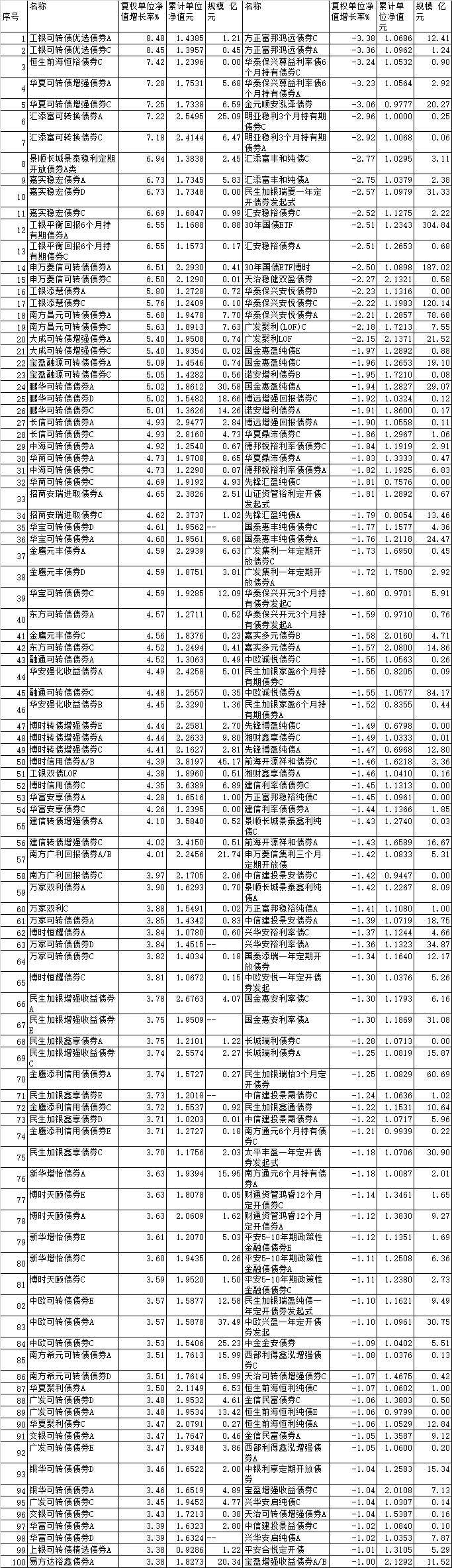 此外,明亚稳利3个月持有期债券C、明亚稳利3个月持有期债券A、民生加银瑞夏一年定开债券发起式、汇安稳裕债券C、鹏扬30年国债ETF、汇安稳裕债券A等多只债券跌幅则超过了2.5%。
