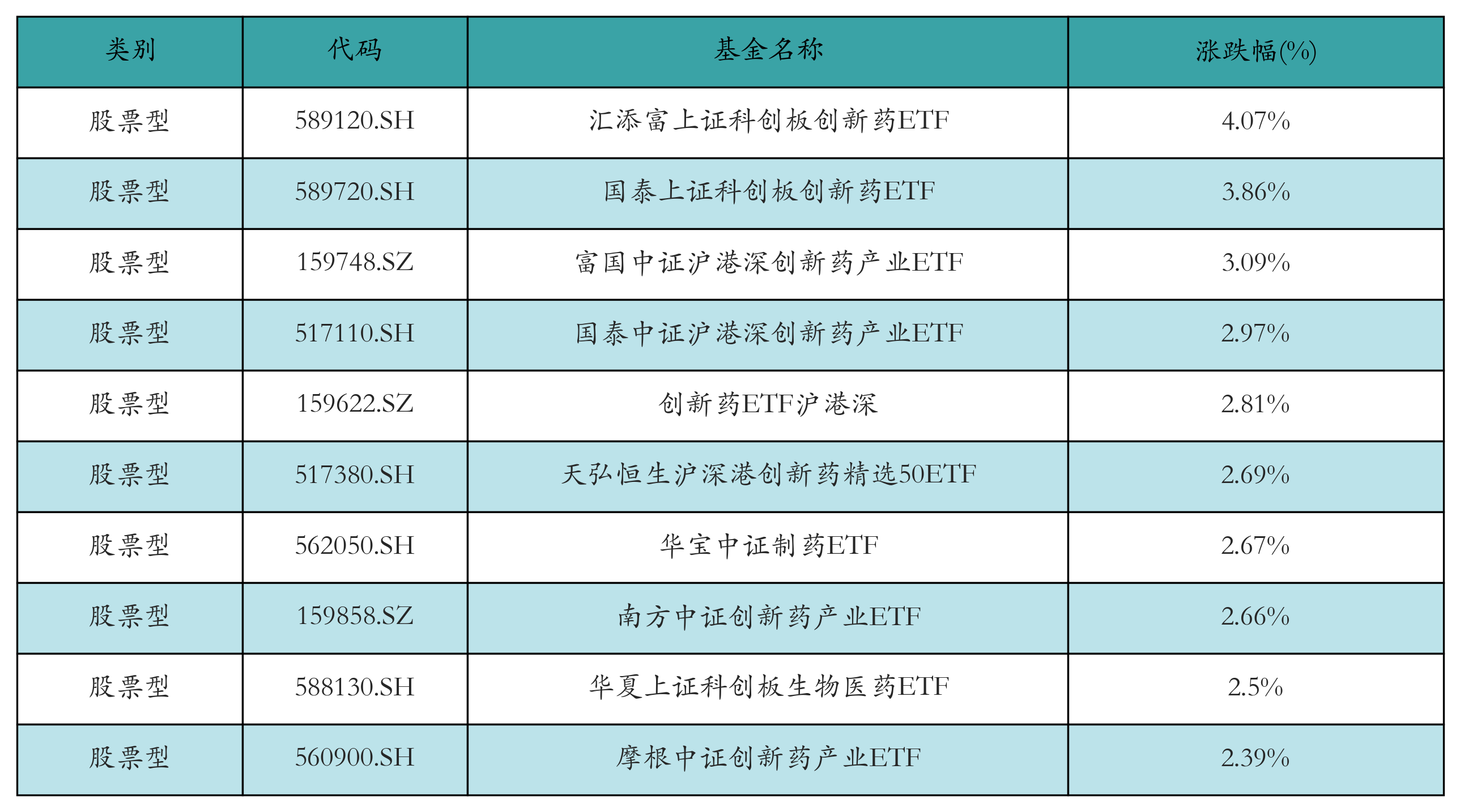 昨日股票型ETF涨幅最高的3只ETF及其收益率分别为:汇添富上证科创板创新药ETF(4.07%)、国泰上证科创板创新药ETF(3.86%)、富国中证沪港深创新药产业ETF(3.09%)。涨幅前10详情见下表: