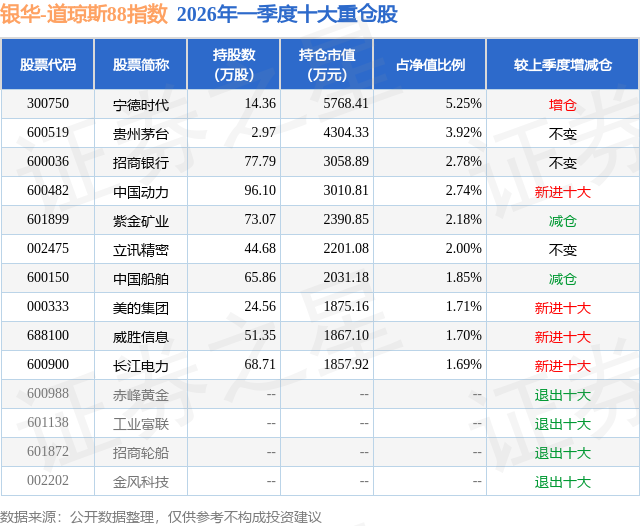 根据2026基金Q1季报公募基金重仓股数据,重仓该股的公募基金共4家,其中持有数量最多的公募基金为银华基金的银华-道琼斯88指数。银华-道琼斯88指数目前规模为10.99亿元,最新净值1.2875(4月27日),较上一交易日上涨0.24%,近一年上涨24.38%。该公募基金现任基金经理为周晶。周晶在任的基金产品包括:银华沪港深增长股票A,管理时间为2018年12月27日至今,期间收益率为106.68%;银华回报定开混合,管理时间为2025年4月30日至今,期间收益率为33.69%;银华嘉瑞平衡混合发起式A,管理时间为2025年10月28日至今,期间收益率为11.36%。